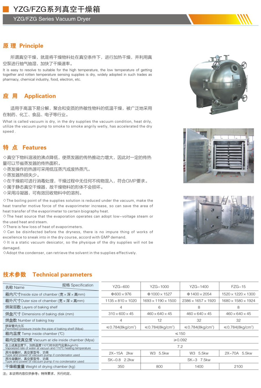 YZG/FZG系列真空干燥機屬于靜態(tài)真空干燥機,該干燥設(shè)備將被干燥物料處于真空條件下進行加熱,并利用真空泵進行抽氣抽濕,使工作室處于真空狀態(tài),物料的干燥速率大大加快,同時也節(jié)省了能源。如采用冷凝器,物料中的溶劑可通過冷凝器加以回收,如溶劑為水,可不用冷凝器,節(jié)省能源投資。